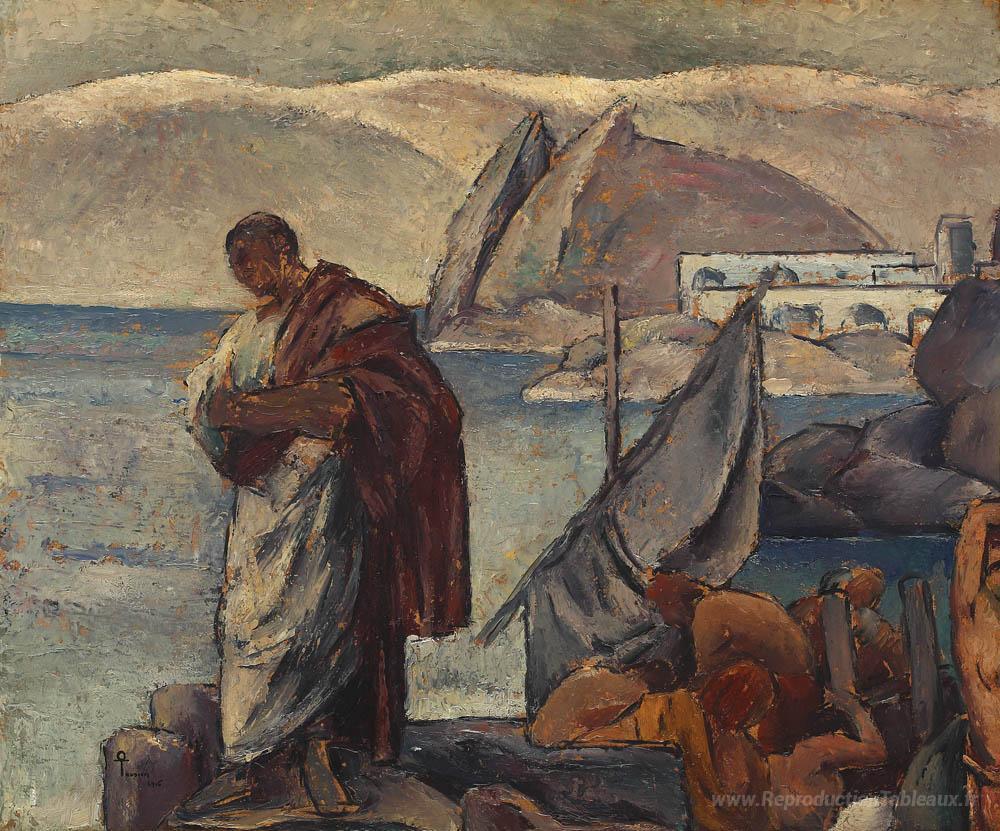Nous vous proposons une reproduction artisanale sur toile du célèbre tableau 'Ovide en exil' de Ion Theodorescu-Sion, provenant du Musée de la Reproduction.