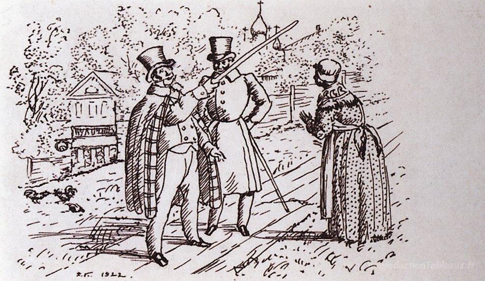 Nous vous proposons une reproduction artisanale sur toile du célèbre tableau 'Parler dans la rue (Lords dans la rue à l'extérieur de la maison' de Boris Kustodiev, provenant du Musée de la Reproduction.