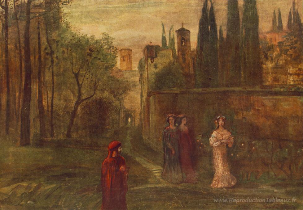 Nous vous proposons une reproduction artisanale sur toile du célèbre tableau 'Rencontre de Dante avec Beatrice' de Lajos Gulacsy , provenant du Musée de la Reproduction.