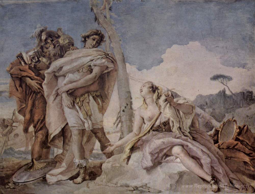 Nous vous proposons une reproduction artisanale sur toile du célèbre tableau 'Rinaldo abandonnant Armida' de Giovanni Battista Tiepolo, provenant du Musée de la Reproduction.