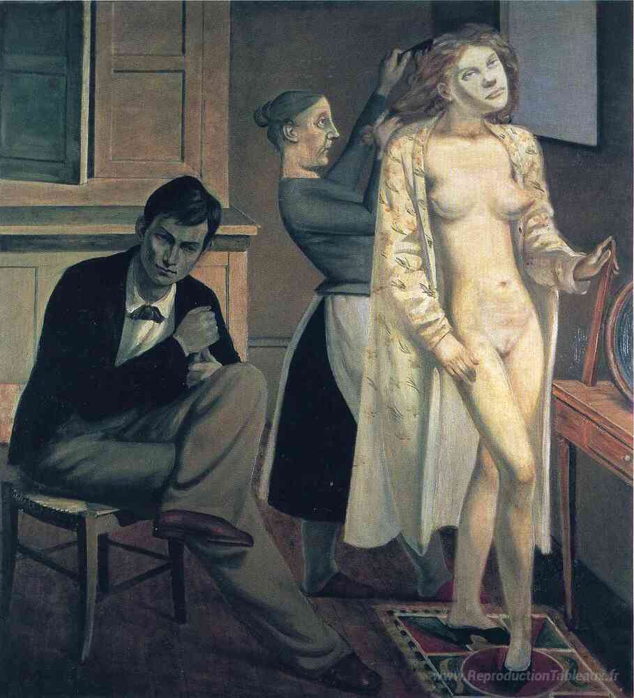 Nous vous proposons une reproduction artisanale sur toile du célèbre tableau 'Toilette de Cathy' de Balthus, provenant du Musée de la Reproduction.