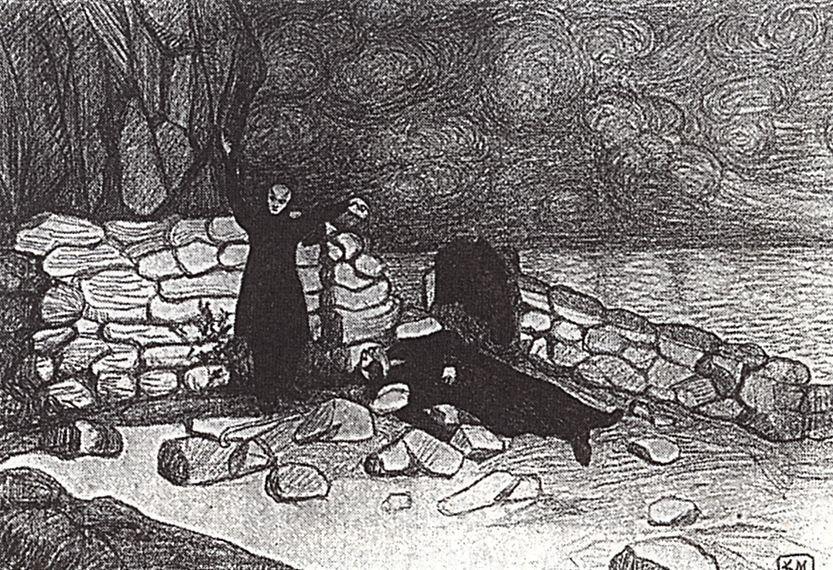 Nous vous proposons une reproduction artisanale sur toile du célèbre tableau 'Une scène du drame de Leonid Andreev Anathema' de Kazimir Malevich, provenant du Musée de la Reproduction.
