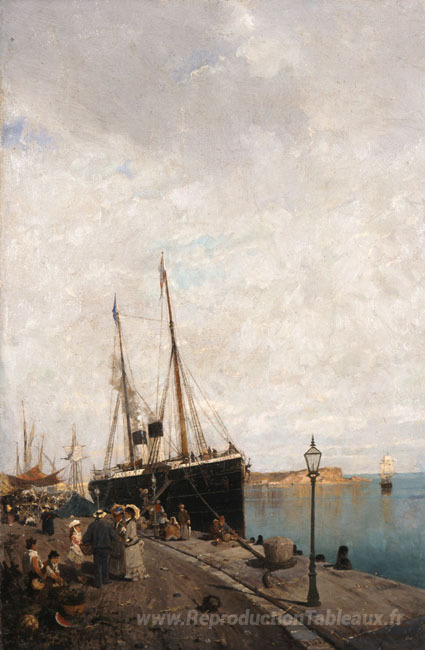 Nous vous proposons une reproduction artisanale sur toile du célèbre tableau 'À la jetée' de Konstantinos Volanakis, provenant du Musée de la Reproduction.