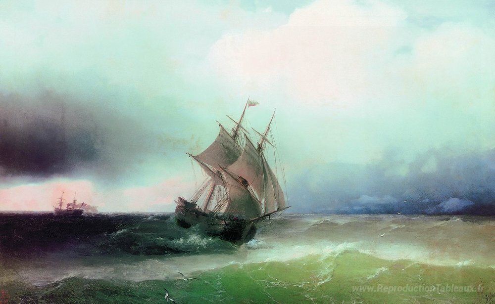 Nous vous proposons une reproduction artisanale sur toile du célèbre tableau 'Approximation de la tempête' de Ivan Aivazovsky, provenant du Musée de la Reproduction.
