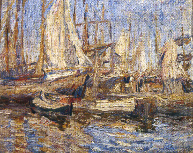 Nous vous proposons une reproduction artisanale sur toile du célèbre tableau 'Arkhangelsk. Navires dans le port.' de Pyotr Konchalovsky, provenant du Musée de la Reproduction.