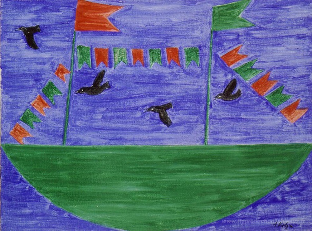 Nous vous proposons une reproduction artisanale sur toile du célèbre tableau 'Barco com Bandeirinhas e Pássaros' de Alfredo Volpi, provenant du Musée de la Reproduction.