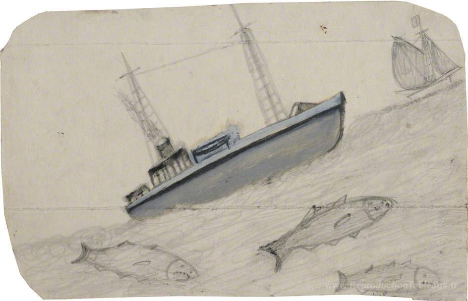 Nous vous proposons une reproduction artisanale sur toile du célèbre tableau 'Bateau à vapeur gris, voilier et trois poissons avec dents' de Alfred Wallis, provenant du Musée de la Reproduction.