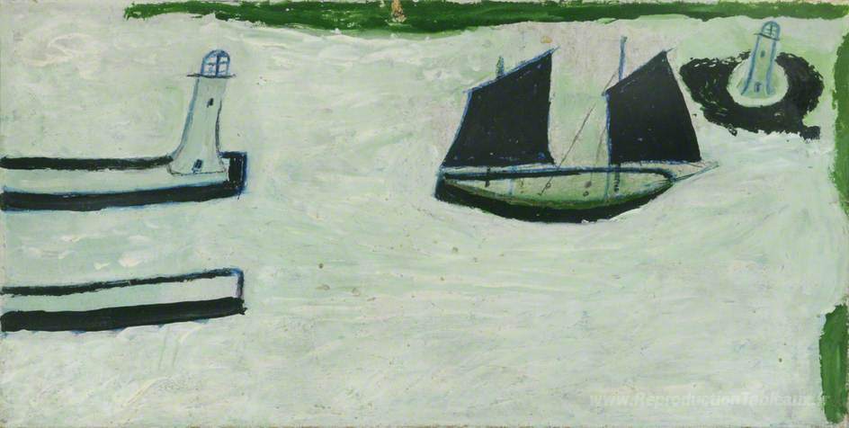 Nous vous proposons une reproduction artisanale sur toile du célèbre tableau 'Bateau de pêche entre deux phares' de Alfred Wallis, provenant du Musée de la Reproduction.