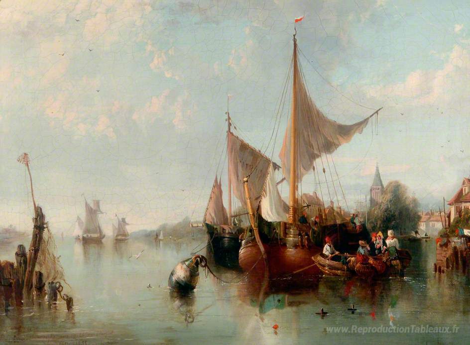 Nous vous proposons une reproduction artisanale sur toile du célèbre tableau 'Bateaux de pêche à Bruges, en Belgique' de James Webb , provenant du Musée de la Reproduction.