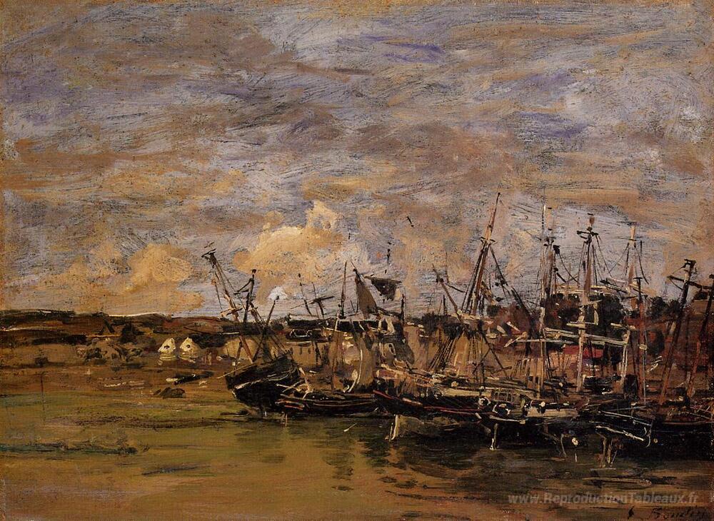 Nous vous proposons une reproduction artisanale sur toile du célèbre tableau 'Bateaux de pêche des portrieux à marée basse' de Eugene Boudin, provenant du Musée de la Reproduction.