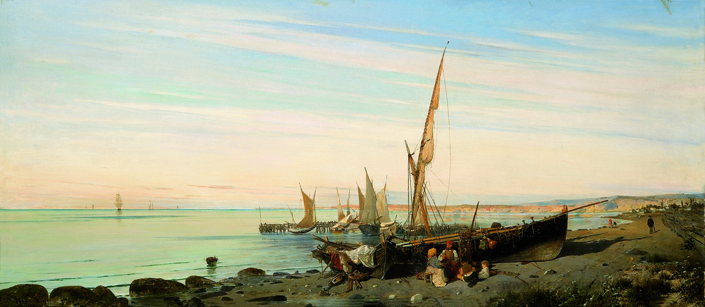 Nous vous proposons une reproduction artisanale sur toile du célèbre tableau 'Bateaux de pêche' de Konstantinos Volanakis, provenant du Musée de la Reproduction.