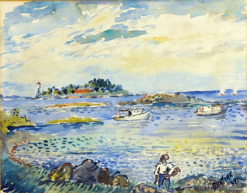 Nous vous proposons une reproduction artisanale sur toile du célèbre tableau 'Bateaux de service dans la baie' de David Burliuk, provenant du Musée de la Reproduction.