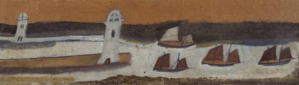 Nous vous proposons une reproduction artisanale sur toile du célèbre tableau 'Chaîne de bateaux' de Alfred Wallis, provenant du Musée de la Reproduction.