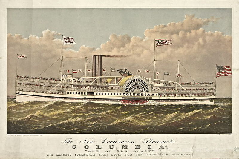 Nous vous proposons une reproduction artisanale sur toile du célèbre tableau 'Columbia, New York Excursion Steamship, construit 1877' de Currier and Ives, provenant du Musée de la Reproduction.