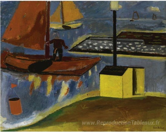 Nous vous proposons une reproduction artisanale sur toile du célèbre tableau 'De Haven' de Gustave de Smet, provenant du Musée de la Reproduction.