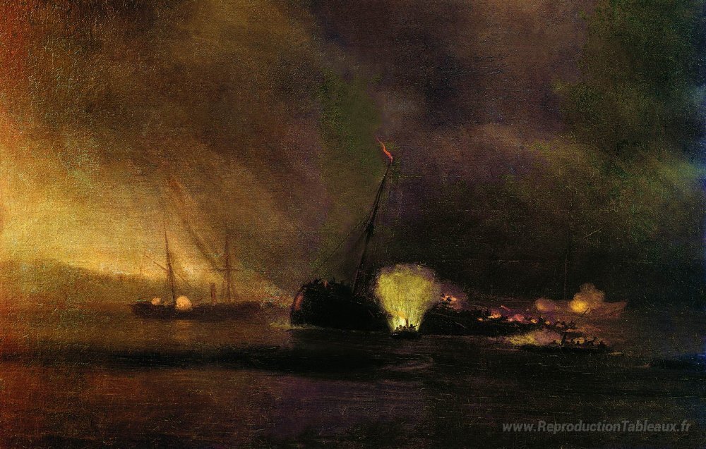 Nous vous proposons une reproduction artisanale sur toile du célèbre tableau 'Explosion du bateau à vapeur à trois mâts à Sulin le 27 septembr' de Ivan Aivazovsky, provenant du Musée de la Reproduction.