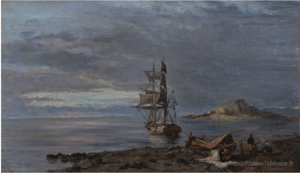 Nous vous proposons une reproduction artisanale sur toile du célèbre tableau 'Frigate grecque à l'ancre' de Konstantinos Volanakis, provenant du Musée de la Reproduction.