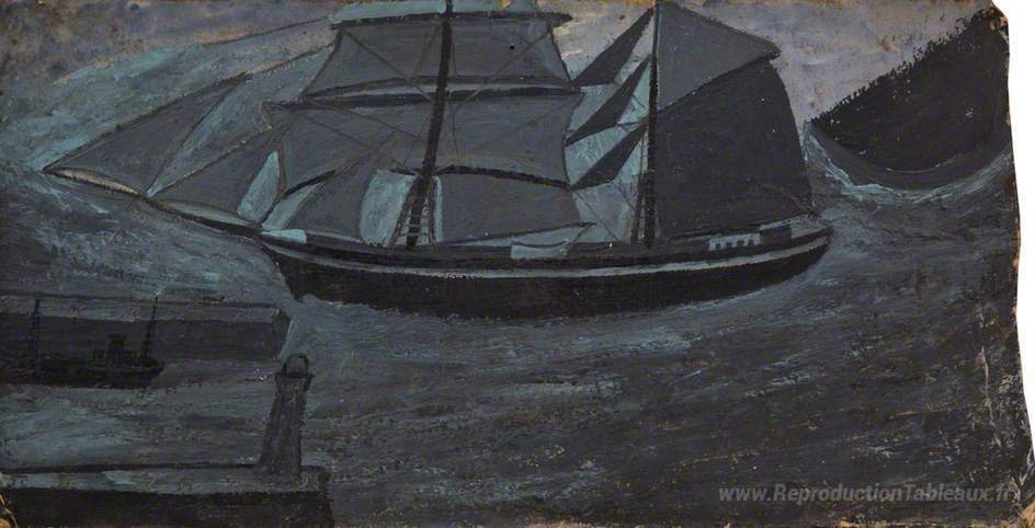 Nous vous proposons une reproduction artisanale sur toile du célèbre tableau 'Gris gris' de Alfred Wallis, provenant du Musée de la Reproduction.