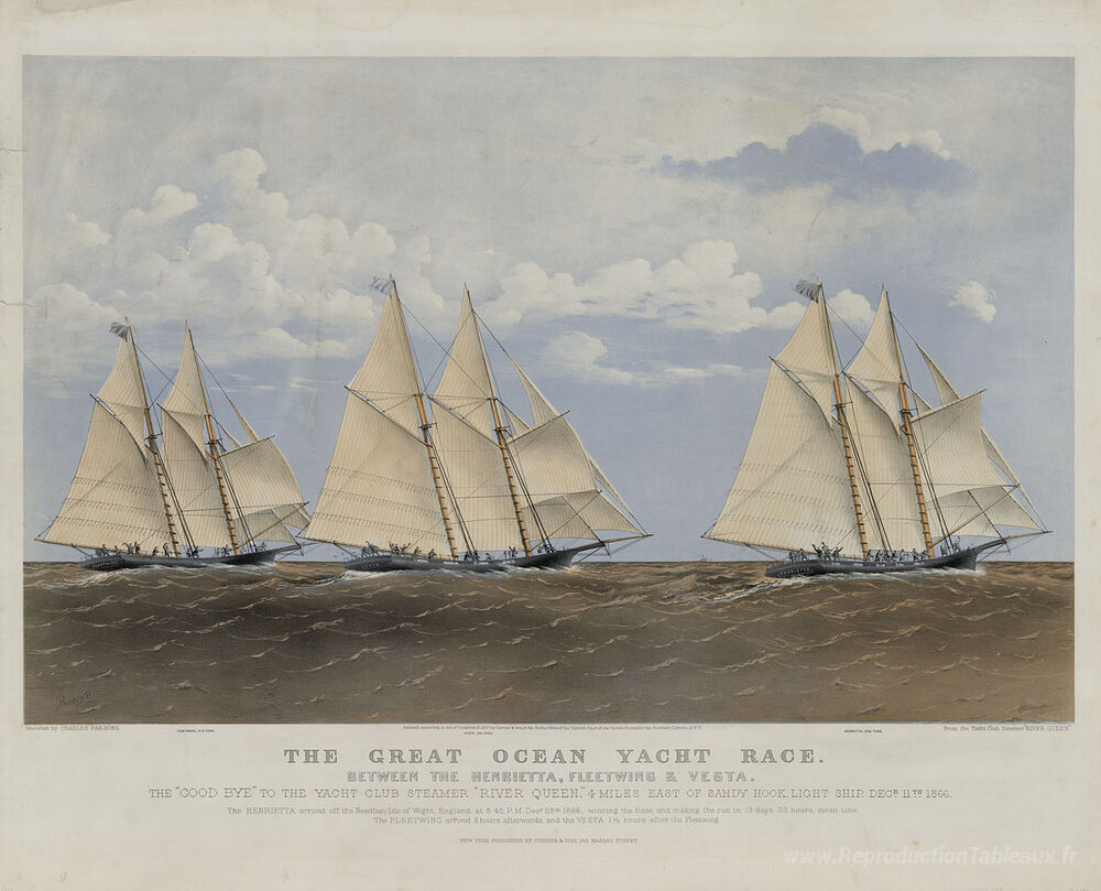 Nous vous proposons une reproduction artisanale sur toile du célèbre tableau 'La Grande Race Yacht Ocean entre Henrietta, Fleetwing et Vesta' de Currier and Ives, provenant du Musée de la Reproduction.