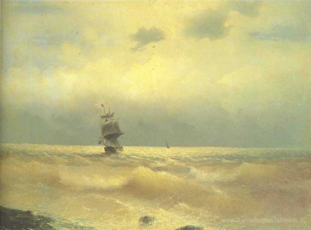 Nous vous proposons une reproduction artisanale sur toile du célèbre tableau 'Le navire près de la côte' de Ivan Aivazovsky, provenant du Musée de la Reproduction.