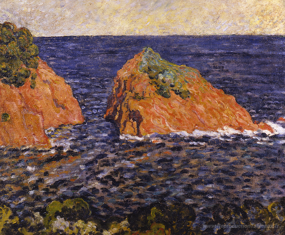 Nous vous proposons une reproduction artisanale sur toile du célèbre tableau 'Le rocher dans la mer' de Louis Valtat, provenant du Musée de la Reproduction.
