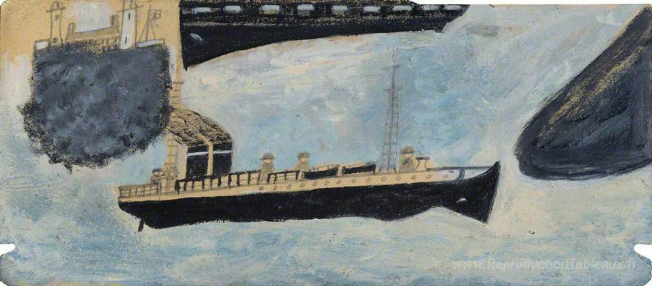 Nous vous proposons une reproduction artisanale sur toile du célèbre tableau 'Navire à moteur avec quatre hommes' de Alfred Wallis, provenant du Musée de la Reproduction.