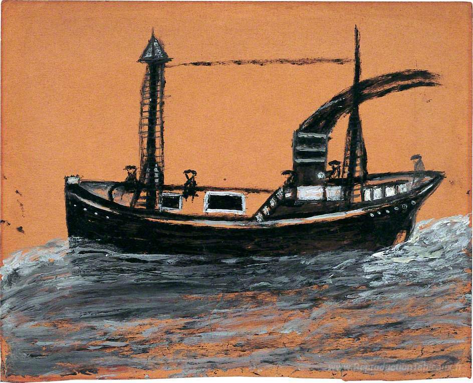 Nous vous proposons une reproduction artisanale sur toile du célèbre tableau 'Navire à vapeur noir' de Alfred Wallis, provenant du Musée de la Reproduction.