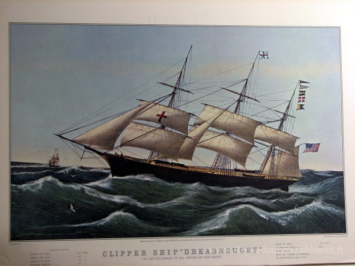 Nous vous proposons une reproduction artisanale sur toile du célèbre tableau 'Navire Clipper «Dreadnought»' de Currier and Ives, provenant du Musée de la Reproduction.
