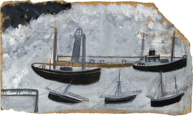 Nous vous proposons une reproduction artisanale sur toile du célèbre tableau 'Navires dans le port' de Alfred Wallis, provenant du Musée de la Reproduction.
