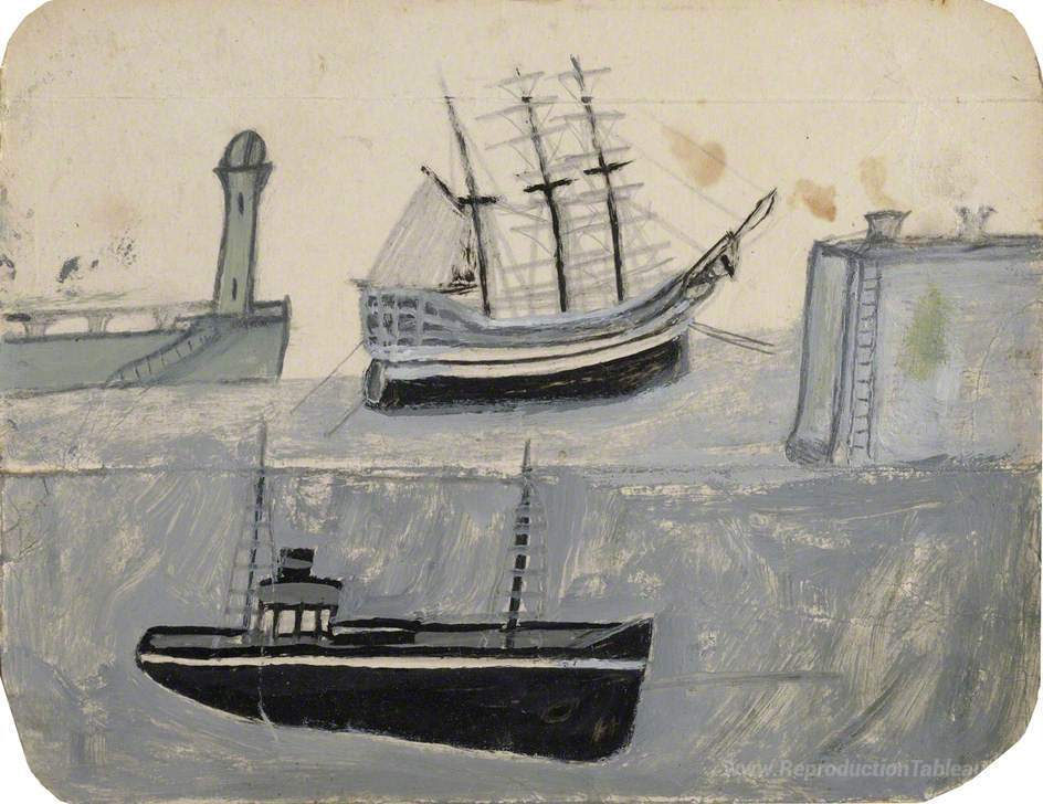 Nous vous proposons une reproduction artisanale sur toile du célèbre tableau 'Navires dans le port' de Alfred Wallis, provenant du Musée de la Reproduction.