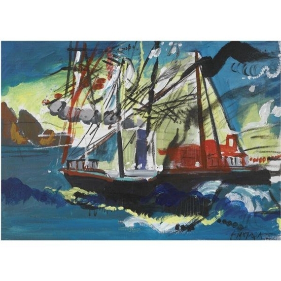 Nous vous proposons une reproduction artisanale sur toile du célèbre tableau 'Navires dans un port' de Dimitris Mytaras, provenant du Musée de la Reproduction.