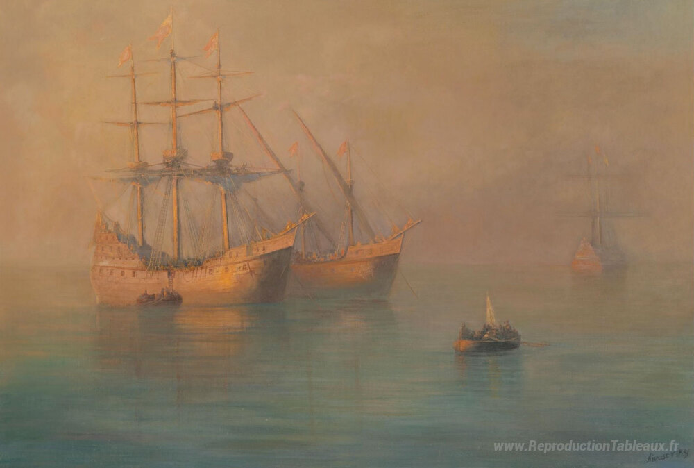 Nous vous proposons une reproduction artisanale sur toile du célèbre tableau 'Navires de Columbus' de Ivan Aivazovsky, provenant du Musée de la Reproduction.