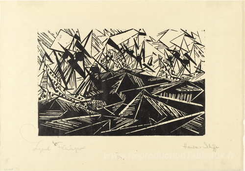 Nous vous proposons une reproduction artisanale sur toile du célèbre tableau 'Navires hanséatiques (Hansaschiffe)' de Lyonel Feininger, provenant du Musée de la Reproduction.