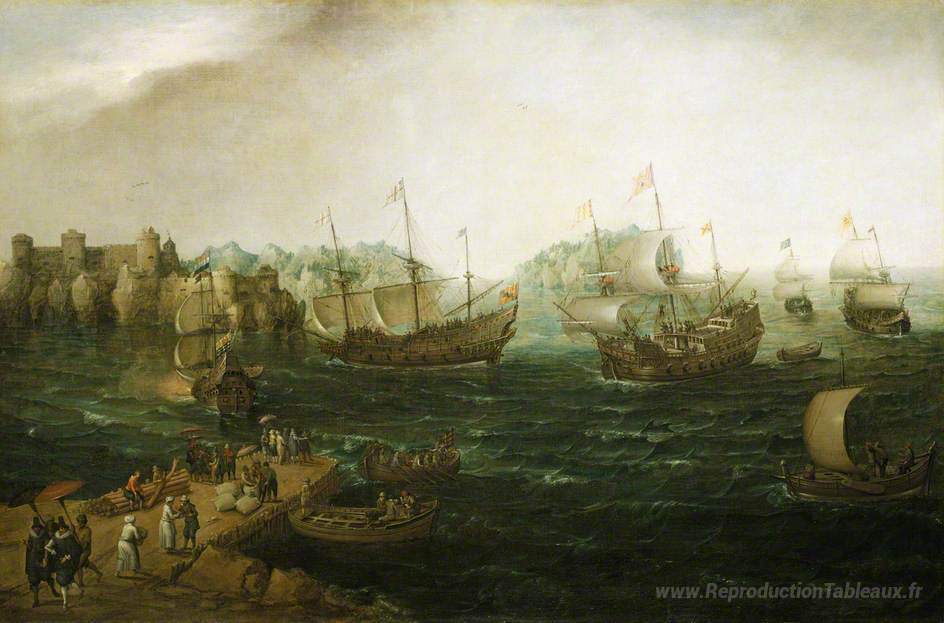 Nous vous proposons une reproduction artisanale sur toile du célèbre tableau 'Navires qui échangent à l'est' de Hendrick Cornelisz Vroom, provenant du Musée de la Reproduction.