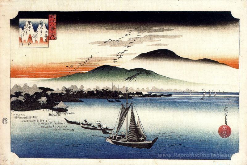 Nous vous proposons une reproduction artisanale sur toile du célèbre tableau 'Oies descendantes, katata' de Hiroshige, provenant du Musée de la Reproduction.