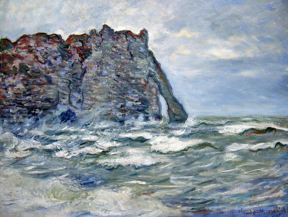 Nous vous proposons une reproduction artisanale sur toile du célèbre tableau 'Port D`aval, mer rugueuse' de Claude Monet, provenant du Musée de la Reproduction.