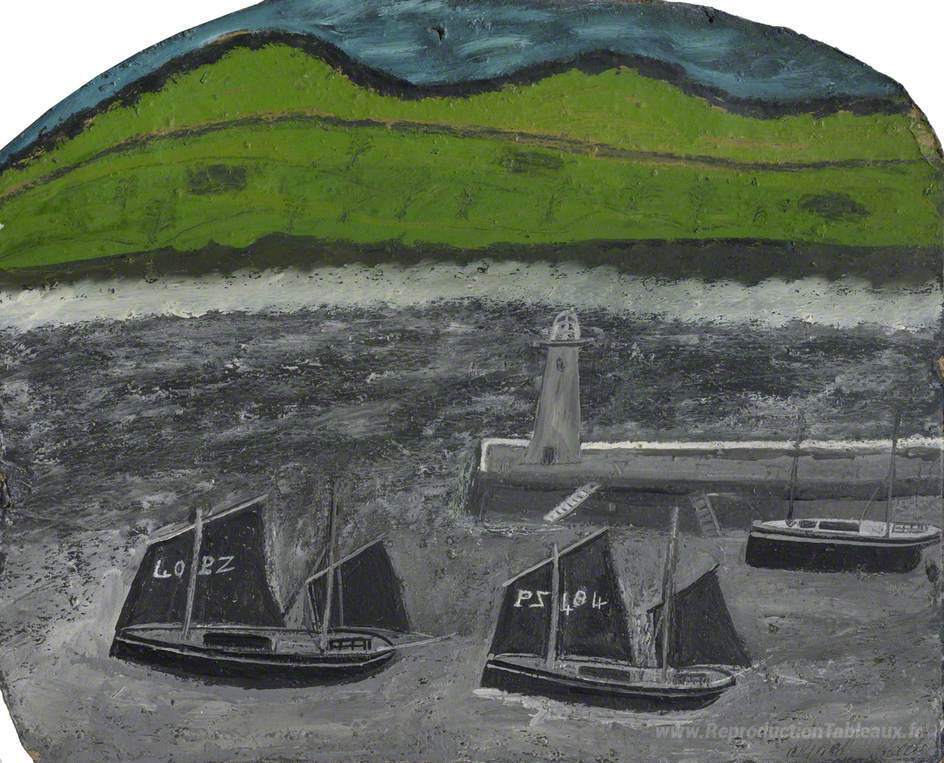 Nous vous proposons une reproduction artisanale sur toile du célèbre tableau 'PZ à voile par une jetée' de Alfred Wallis, provenant du Musée de la Reproduction.