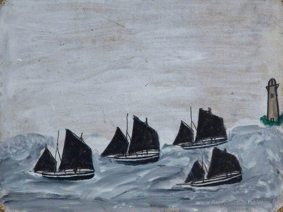 Nous vous proposons une reproduction artisanale sur toile du célèbre tableau 'Quatre bateaux par un phare' de Alfred Wallis, provenant du Musée de la Reproduction.