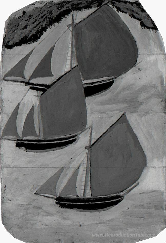 Nous vous proposons une reproduction artisanale sur toile du célèbre tableau 'Trois navires de taille gris' de Alfred Wallis, provenant du Musée de la Reproduction.