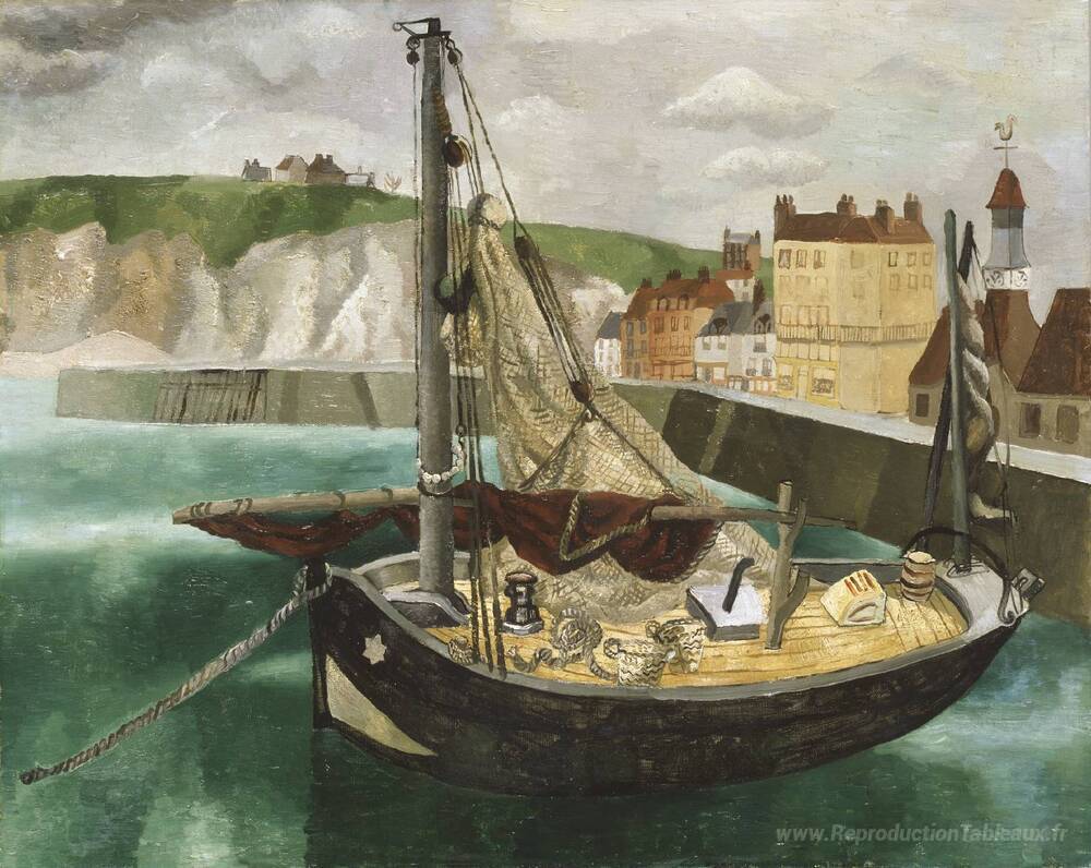 Nous vous proposons une reproduction artisanale sur toile du célèbre tableau 'Un bateau de pêche dans le port de Dieppe' de Christopher Wood, provenant du Musée de la Reproduction.