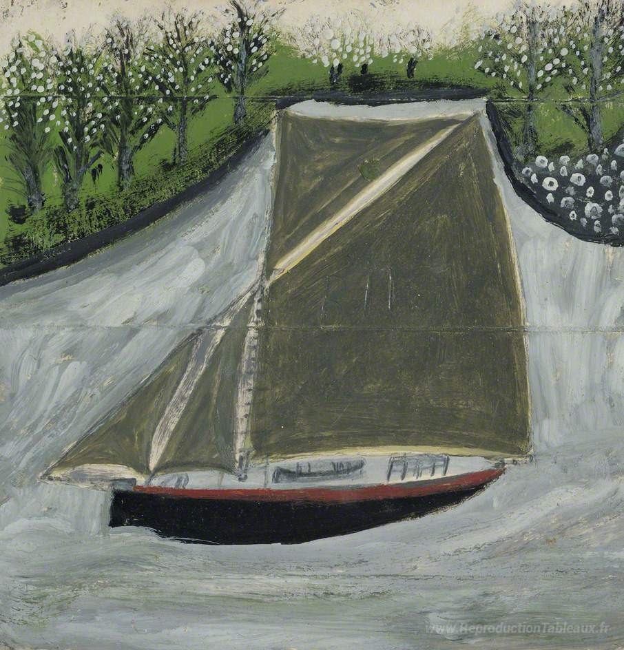 Nous vous proposons une reproduction artisanale sur toile du célèbre tableau 'Voilier et verger 1937' de Alfred Wallis, provenant du Musée de la Reproduction.