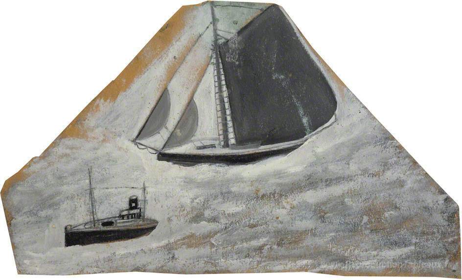 Nous vous proposons une reproduction artisanale sur toile du célèbre tableau 'Voilier gris et petit bateau' de Alfred Wallis, provenant du Musée de la Reproduction.