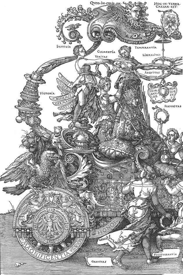 Nous vous proposons une reproduction artisanale sur toile du célèbre tableau 'La grande voiture triomphale' de Albrecht Durer, provenant du Musée de la Reproduction.