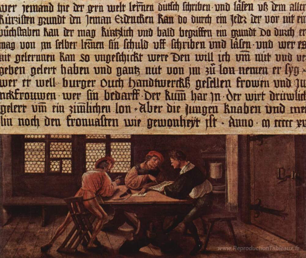 Nous vous proposons une reproduction artisanale sur toile du célèbre tableau 'Un professeur d'école expliquant le sens d'une lettre aux travai' de Hans Holbein the Younger, provenant du Musée de la Reproduction.
