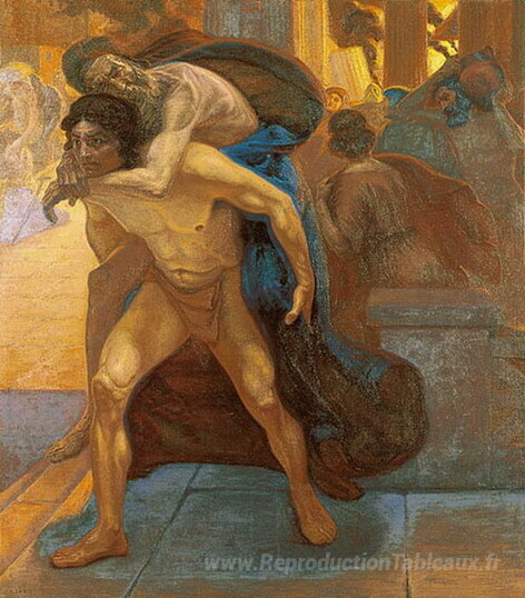 Nous vous proposons une reproduction artisanale sur toile du célèbre tableau 'Énée sauvant son père à travers les flammes de Troy' de Emmanuel Zairis, provenant du Musée de la Reproduction.