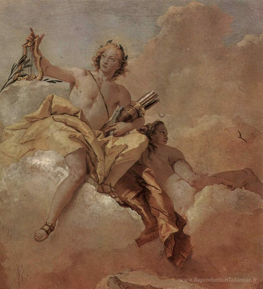 Nous vous proposons une reproduction artisanale sur toile du célèbre tableau 'Apollo et Diana' de Giovanni Domenico Tiepolo, provenant du Musée de la Reproduction.