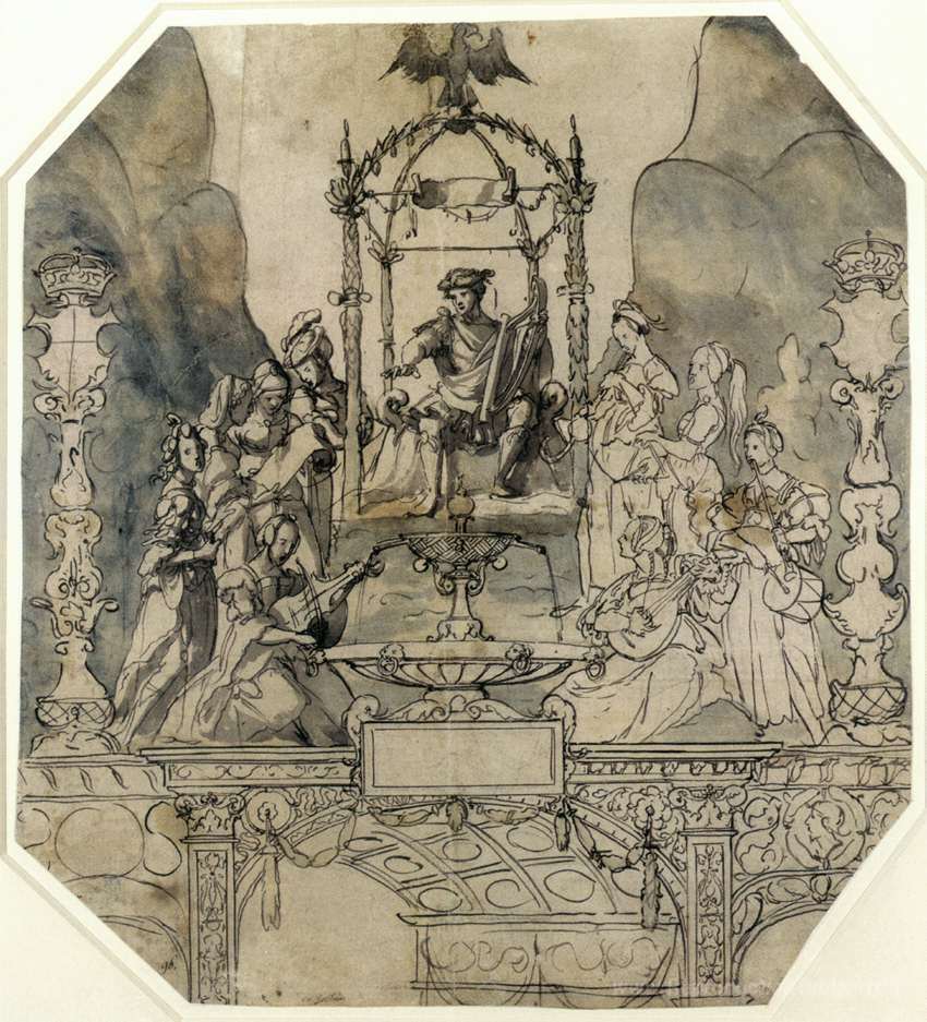 Nous vous proposons une reproduction artisanale sur toile du célèbre tableau 'Apollo et les muses sur Parnasse' de Hans Holbein the Younger, provenant du Musée de la Reproduction.