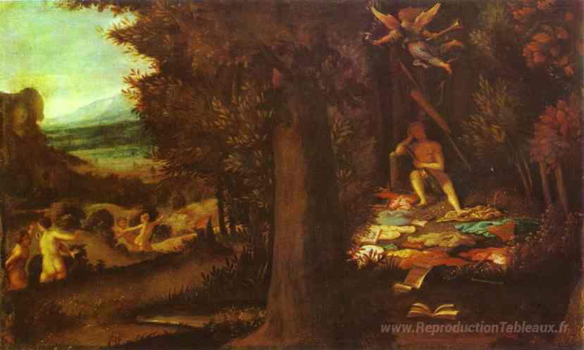 Nous vous proposons une reproduction artisanale sur toile du célèbre tableau 'Apollon endormi, muses et FAMA' de Lorenzo Lotto, provenant du Musée de la Reproduction.