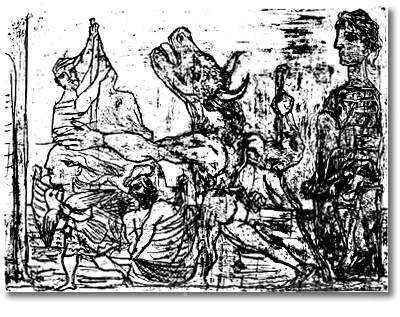 Nous vous proposons une reproduction artisanale sur toile du célèbre tableau 'Blind Minotaur est guidé par la fille' de Pablo Picasso, provenant du Musée de la Reproduction.