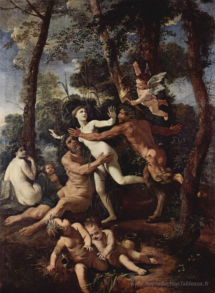Nous vous proposons une reproduction artisanale sur toile du célèbre tableau 'Casserole et syrinx' de Nicolas Poussin, provenant du Musée de la Reproduction.